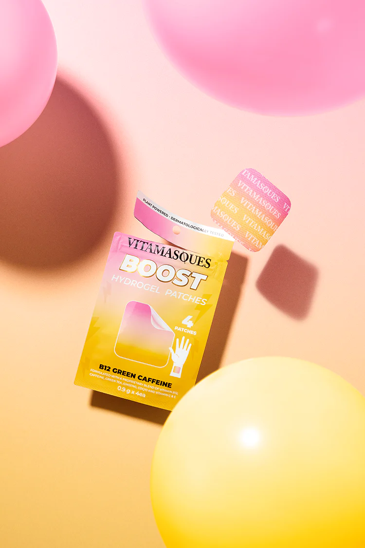 Start your day with Vitamasques' energy patches, infused with caffeine, Vitamin B12, green tea, and ginseng for a 12-hour vitality boost. Enjoy plant-powered patches for the energy your body needs!